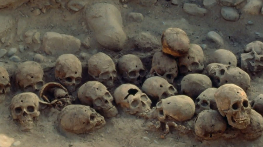 Hlava je znamením života. Bez hlavy nelze žít. Jedná se proto o velice mocný symbol. Symbol kultury Nazca. Na pohřebních nádobách jsou často k vidění obrazy oddělených hlav v rukou lidí i bohů. A lebek, z nichž vyrůstají stromy. Je to jasný důkaz, že tihle vynalézaví zemědělci a tvůrci tajemných obrazců praktikovali lidské oběti. Pochopíme-li důvody těchto hrůzných obřadů, pak možná odhalíme i záhadu nazcaských obrazců. Archeologové chtějí využít robotickou helikoptéru k pořízení vůbec první trojrozměrné digitální mapy nazcaských obrazců. Digitální kamera připevněná ke spodní části helikoptéry dokáže pořídit stovky snímků ve vysokém rozlišení. Digitální model je neobyčejně podrobný, protože fotoaparát s vysokým rozlišením dokáže na zemi zachytit i podrobnosti o velikosti 5 centimetrů. Díky podrobné trojrozměrné mapě může tým vědců pochopit význam nazcaských obrazců neboli geoglyfů. Mapa složená z leteckých snímků pořízených z velkých výšek vytváří úplný obraz. Propojuje tajemné obrazce s pouštní krajinou a starověkými sídly.